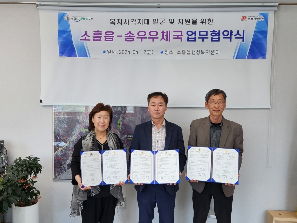 이날 협약식에는 유재현 소흘읍장, 소흘읍 지역사회보장협의체 김경복 민간위원장, 송우우체국 최창상 국장이 참석했다.