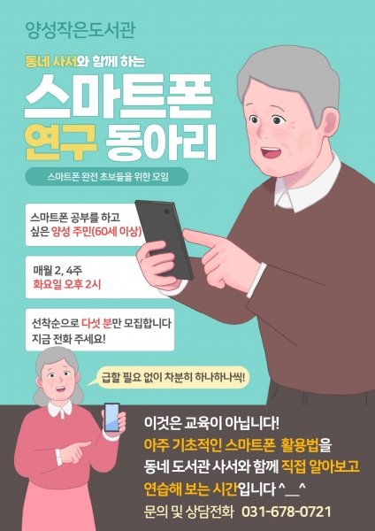 [금요저널] 안성시 양성작은도서관은 스마트폰 활용에 어려움을 겪는 마을 주민들을 위한 ‘양성작은도서관 스마트폰 연구회’ 동아리를 5월부터 운영한다.