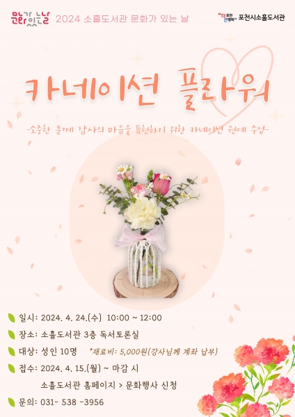 소흘도서관에서 진행하는 ‘문화가 있는 날’ 프로그램은 ▲카네이션 플라워 ▲라탄으로 만드는 감성 소품 ▲인생샷을 부탁해 ▲가족 팝아트 초상화 ▲오일 파스텔 감성 드로잉 ▲프랑스 자수 클립 책갈피 ▲캘리로 읽은 시 ▲세계인을 사로잡은 애프터눈 티 ▲자이언트 얀 가방 만들기 등이 예정돼 있다.