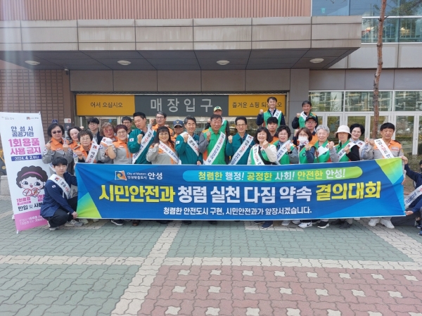 [금요저널] 안성시 시민안전과는 지난 12일 안전 점검의 날 캠페인 전개시 유태일 부시장, 안성소방서 안성의용소방대, 지역자율방재단, 시민안전과 직원이 참석한 가운데 ‘1회용품 제로 실천 다짐대회’를 개최했다.