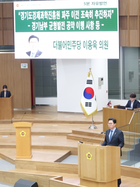 [금요저널] 경기도의회 경제노동위원회 이용욱 의원은 16일 경기도의회 제374회 임시회 제1차 본회의 5분 자유발언을 통해 경기도경제과학진흥원 파주 이전 추진을 촉구했다.