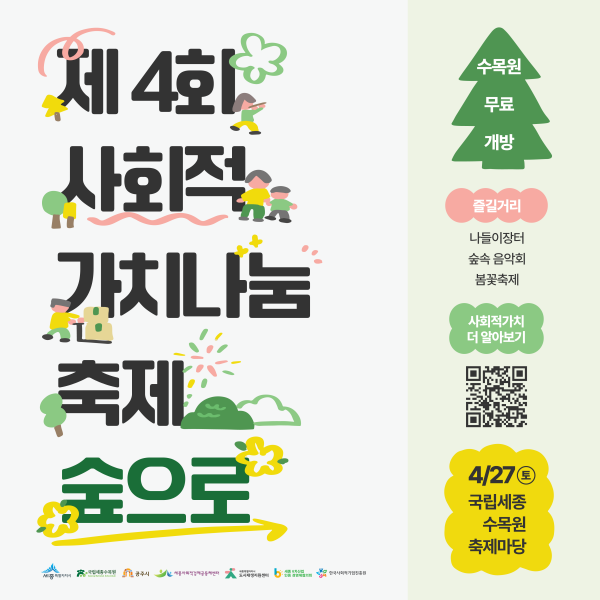 [금요저널] 세종특별자치시가 ‘제4회 사회적 가치나눔 축제, 숲으로’ 행사를 오는 27일 토요일 오전 9시부터 오후 6시까지 국립세종수목원 축제마당에서 개최한다.