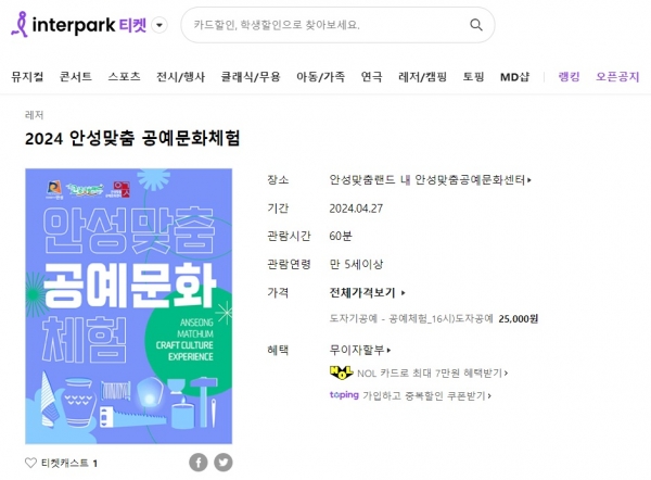 티켓은 인터파트 티켓에서 “안성맞춤 공예문화체험”을 검색해 예약할 수 있고 자세한 체험 프로그램별 일정은 인터파크 예약사이트에서 확인할 수 있다.