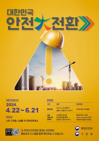 이어 점검 대상 외에도 시민이 자율적으로 안전을 점검할 수 있도록 오는 22일부터 순차적으로 주택 및 다중이용시설 자율 안전 점검표를 배포하며 점검이 필요하다고 생각하는 소규모 시설 등 안전관리 사각지대에 대해 시민이 직접 안전 점검을 신청하는 ‘주민점검 신청제’를 운영해 시민이 함께 참여하고 소통하는 실효성 있는 집중 안전 점검 구현에 나선다고 덧붙였다.