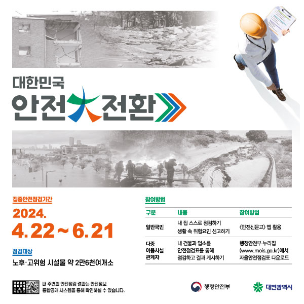 [금요저널] 대전시는 4월 22일부터 6월 21일까지 재난·사고 발생 위험을 해소하기 위해 대한민국 안전大전환 집중안전점검을 실시한다.