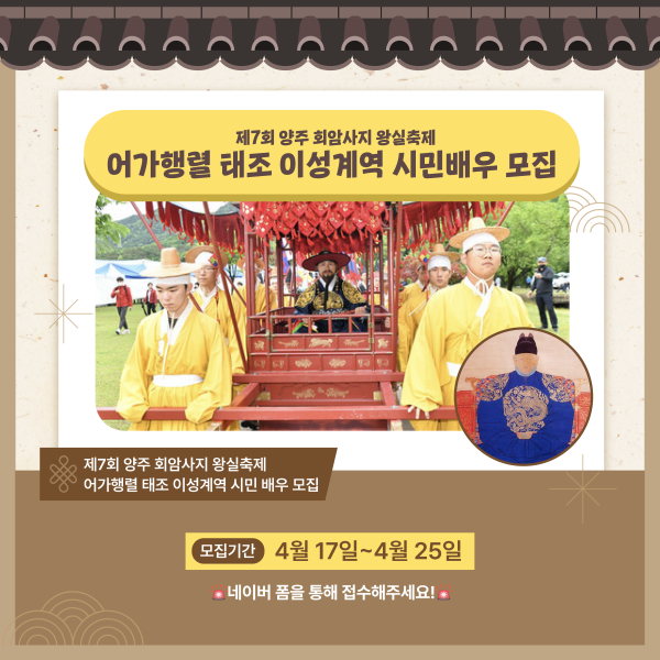 [금요저널] 양주시가 5월 11일~12일 양주 회암사지 유적 일원에서 개최되는‘제7회 양주 회암사지 왕실축제’어가행렬에 참여할 태조 이성계역을 시민 공모한다.