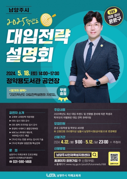 공교육 입시전문성을 대표하는 EBS 대표강사 윤윤구 강사가 초청되어 주요 대입 전형 정보를 남양주시 맞춤형으로 제공하며 2025학년도 이후 변화하는 대입 최신 트렌드 정보와 전형별 전략 등 대입 경쟁력을 강화하는 방법에 대해 강연해 학생들의 실질적인 진로 준비에 도움을 줄 전망이다.