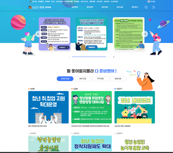 시는 지난해 7월, 시청 홈페이지 내에 ‘안성청년포털’을 새롭게 구축해 청년정책과 관련된 최신 정보는 물론, 미래세대의 시정 참여 확대와 양방향 소통 등 양질의 서비스를 제공하고 있다.