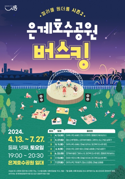 은계호수공원에서는 둘째, 넷째 주 토요일 저녁 19시에 ‘컬러풀 원더풀 시즌2’가, 거북섬에서는 둘째, 넷째 주 토요일 오후 4시에 ‘버스킹 라이브 인 거북섬’ 공연이 진행된다.