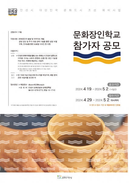공고문 및 지원서류 등 자세한 사항은 문화도시안성 블로그와 안성시 홈페이지에서 확인할 수 있다.