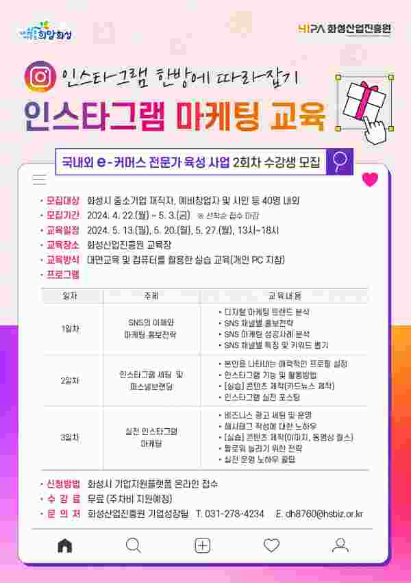 이번 2회차 교육은 △SNS의 이해와 마케팅 홍보전략 △인스타그램 세팅 및 퍼스널브랜딩 △실전 인스타그램 마케팅 등 ‘인스타그램 마케팅’을 주제로 5월 13일 20일 27일 총 3회에 걸쳐 화성산업진흥원 교육장에서 진행될 예정이다.