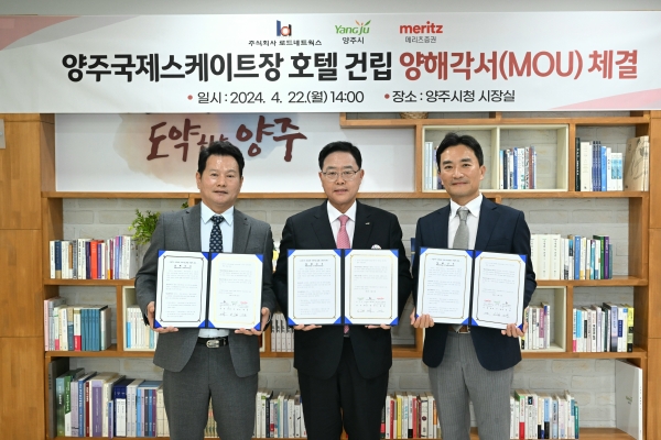 22일 시에 따르면 양주시는 시청에서 ㈜로드네트웍스, 메리츠증권과 ‘국제스케이트장 숙박시설 건립을 위한 양해각서’를 체결했다고 밝혔다.