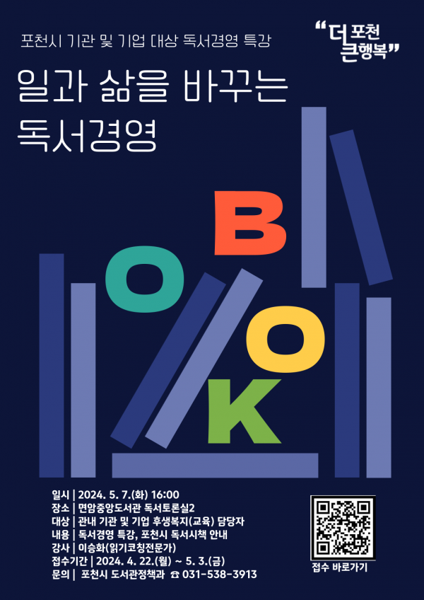 [금요저널] 포천시는 오는 5월 7일 면암중앙도서관에서 관내 기관 및 기업을 대상으로 ‘독서경영’ 특강을 실시한다.