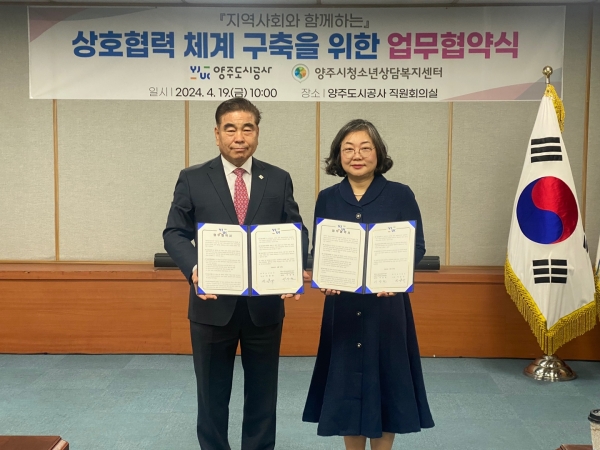 [금요저널] 양주시청소년상담복지센터가 지난 19일 양주도시공사와 위기 청소년과 가족에 대한 문화 복지지원을 위한 업무협약을 체결했다고 밝혔다.