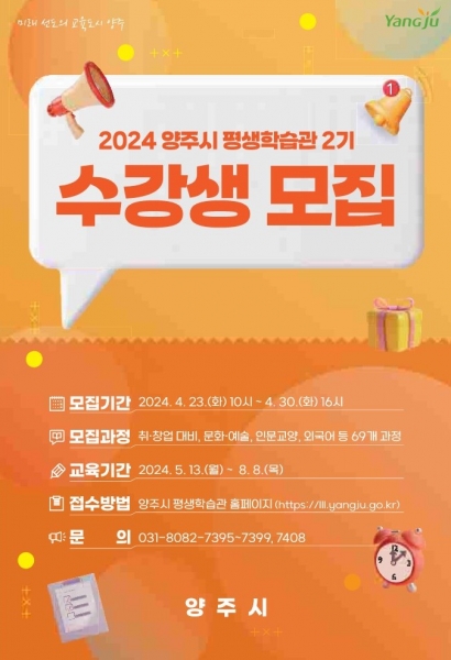 양주시, ‘2024년 제2기 평생학습관 프로그램’ 수강생 모집ⵈ 오는 30일까지