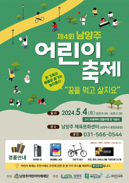 ‘제4회 남양주 어린이 축제’에서 놀이마당 등은 오전 9시 30분부터 오후 2시 30분까지, 경품행사와 이벤트마당은 2시 30분부터 3시 30분까지 진행된다.