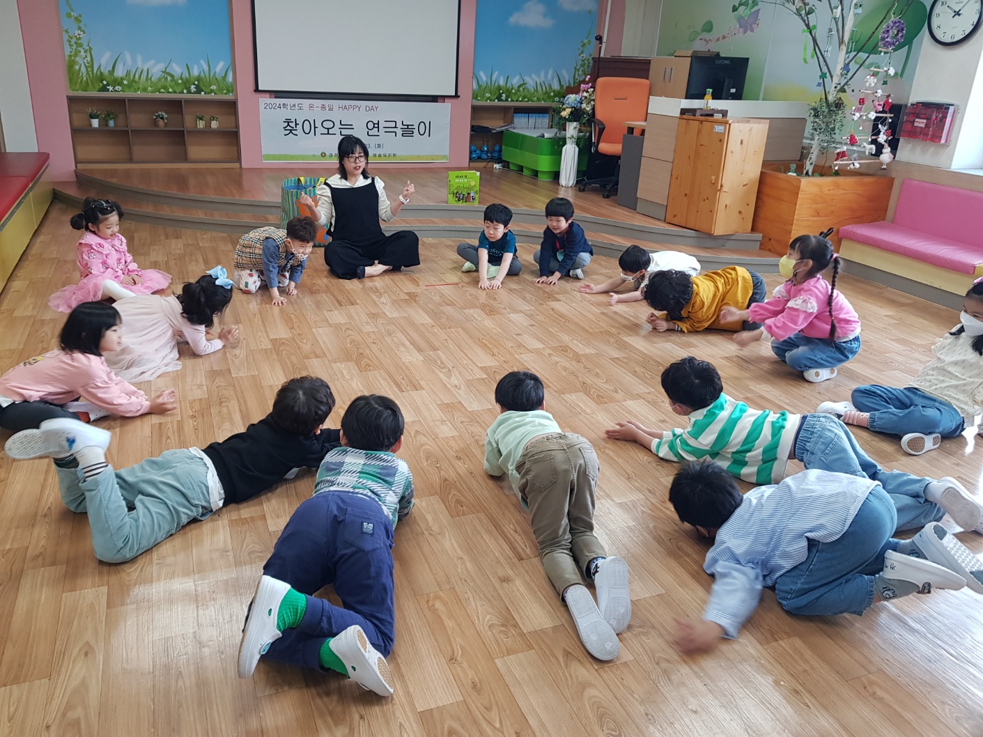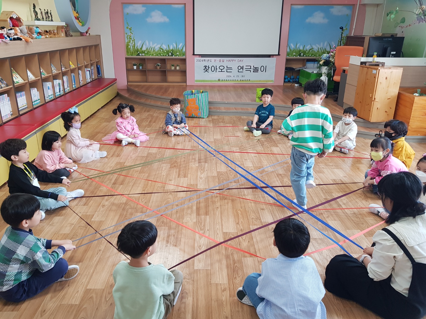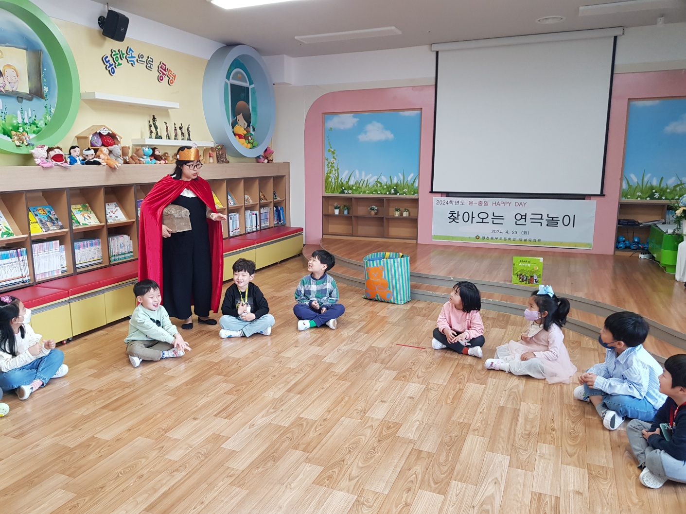 영천동부초등학교병설유치원(원장 김정락)은 4월 23일(화) 본원 도서실에서 특색교육 온-종일 HAPPY DAY와 관련하여 “2024학년도 찾아오는 연극놀이 체험”을 실시하였다.