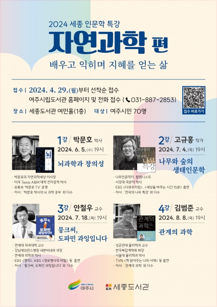 [금요저널] 여주시는 오는 6월 첫째 주 수요일부터 8월 첫째 주 목요일까지 세종도서관 여민홀에서 ‘세종 인문학 특강’ ‘자연과학 편’을 운영한다.