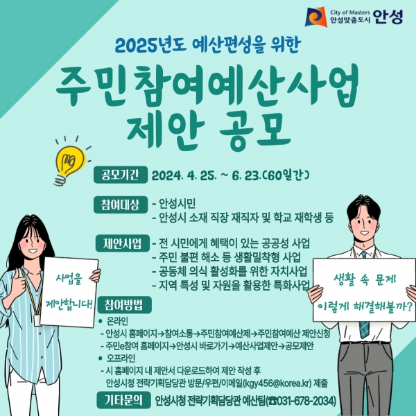 주민참여예산사업 제안 공모에는 안성시민과 안성시 소재 직장의 재직자 등이 참여할 수 있으며 2025년도에 안성시에서 추진하기를 희망하는 사업을 제안하면 된다.