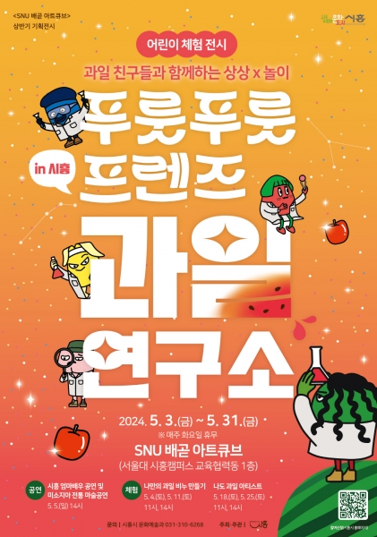 [금요저널] 시흥시가 5월 가정의 달을 기념해 어린이를 위한 체험전시인 ‘2024 푸룻푸룻 프렌즈 과일연구소’를 5월 3일부터 31일까지 SNU 배곧 아트큐브에서 개최한다.