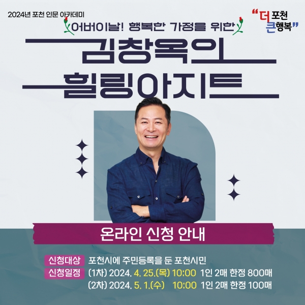 한편 ‘김창옥의 힐링아지트’ 인문학 콘서트 2차 신청 접수는 오는 5월 1일 10시 포천시민을 대상으로 시작한다.