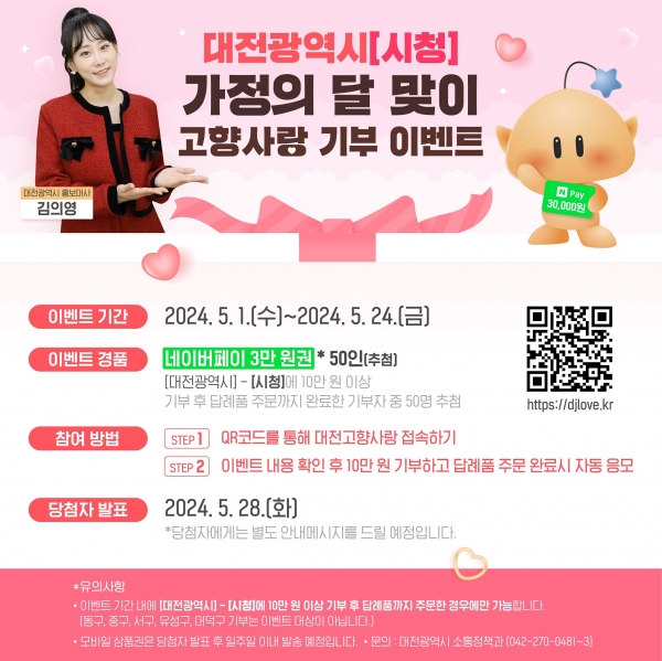 자세한 내용은 대전고향사랑, 블로그, 사회관계망서비스의 ‘가정의 달 맞이 고향사랑 기부 이벤트’에서 확인할 수 있다.