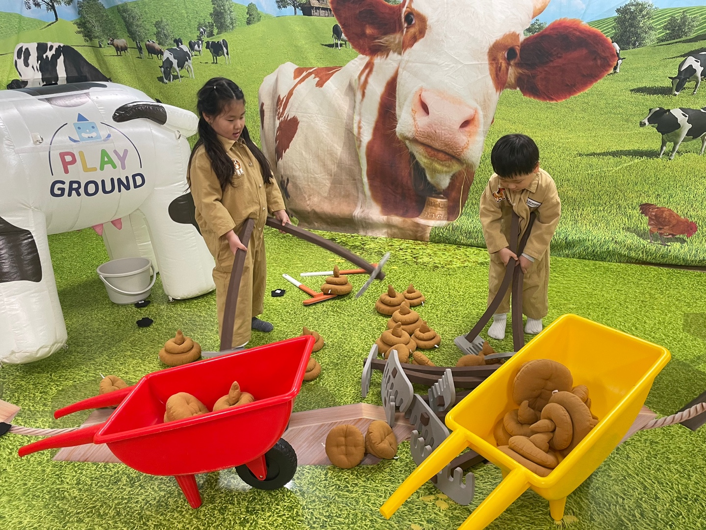 이후 유아들은 동물농장 주인 옷으로 갈아입은 뒤 초대형 젖소에게 먹이도 주고 먼지도 깨끗하게 씻겨주는 놀이를 하였다. 젖소가 눈 똥을 수레로 옮겨주는 게임에도 즐겁게 참여해보면서 동물 농장에서 할 수 있는 일에 대해 경험해볼 수 있었다. 양계장으로 이동한 뒤 계란 모형을 찾아 파이프에 굴려도 보고 깨끗해진 계란을 통에 담아 마트로 배달해주는 경험을 통해 계란의 유통 과정을 알아볼 수 있었다.