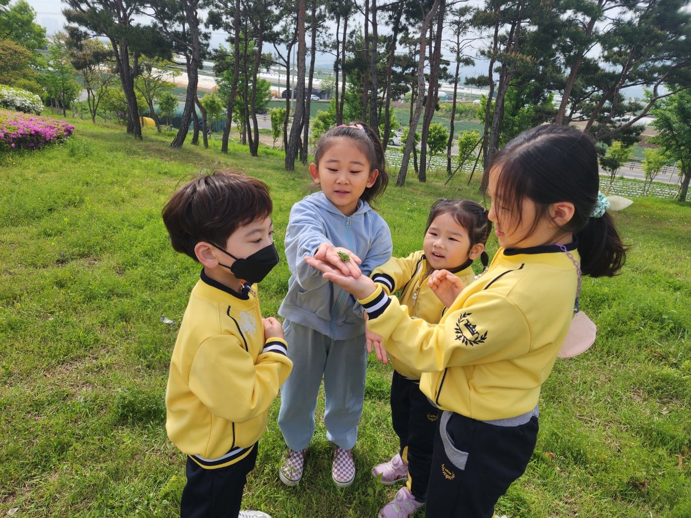□ 좌학근린공원에서 유아들은 자연 속 보물찾기, 틀린 자연 찾기, 동생 손 잡고 산책하기, 풀피리 불기, 개구리 관찰하기 등 봄에 할 수 있는 다양한 자연 놀이를 경험하며, 봄의 공원에서, 친구와 보물을 찾아 나서는 짜릿한 경험을 할 수 있었다. 자연 놀이를 즐기던 7세 유아는 “잎이 초록색인데 연두색이고 초록색인데 바다색이예요”라며 자연의 다채로운 색을 표현하였다.