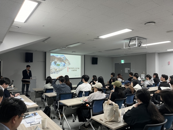 용인대학교 AI융합대학 경영학과 재학생 약 100여명이 참석한 이번 채용설명회에서는 진로탐색과 취업준비를 위해 용인대학교 경영학과 재학생이 용인미르스타디움에 견학오는 일정에 공사 취업 설명회를 함께 진행해 채용 정보를 제공하고 공사 직무를 소개했다.