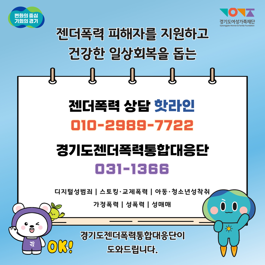 ‘젠더폭력 상담 핫라인’은 가정폭력, 성폭력, 디지털 성범죄, 스토킹, 교제폭력(데이트폭력), 아동․청소년 성착취 등 모든 젠더폭력 피해에 대한 상담과 지원을 받을 수 있는 창구다. 경기도 젠더폭력 통합대응단에서 24시간 365일 운영한다.