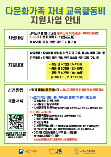임동현 시흥시 외국인주민과장은 “다문화가족 자녀가 미래 인재로 성장할 수 있도록 지속해서 지원할 것이며 이번 교육활동비 지원사업 대상자가 빠짐없이 신청해 지원받을 수 있도록 많은 관심을 부탁한다”고 말했다.