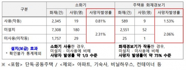 최근 10년 간 경기도내에서 발생한 주택화재 13,488건에 대해 주택용 소방시설 설치 효과를 분석한 결과, 소화기를 사용한 경우 미설치·미사용에 비해 사망자 발생률은 약 33% 수준으로 주택용 화재경보기가 설치된 경우 사망자 발생률은 약 75% 수준으로 저감됐다.