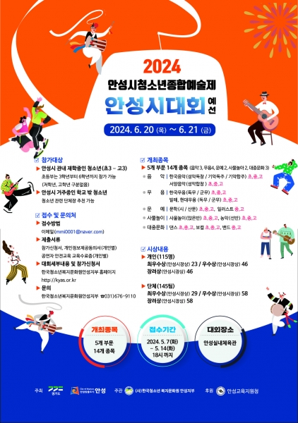 예선을 주관하는 안성시 관계자는 “청소년들이 예술적 재능을 마음껏 표출할 수 있도록 지원해 나갈 것”이라며 “경기도청소년종합예술제 안성시 예선에 많은 청소년이 참가하길 바란다”고 말했다.