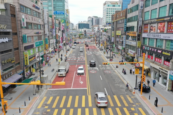 구는 이번 사업을 통해 보도 폭을 5m에서 6m로 확장했으며 보도 판석을 완만하게 재포장해 보행자의 편의성을 고려했다.