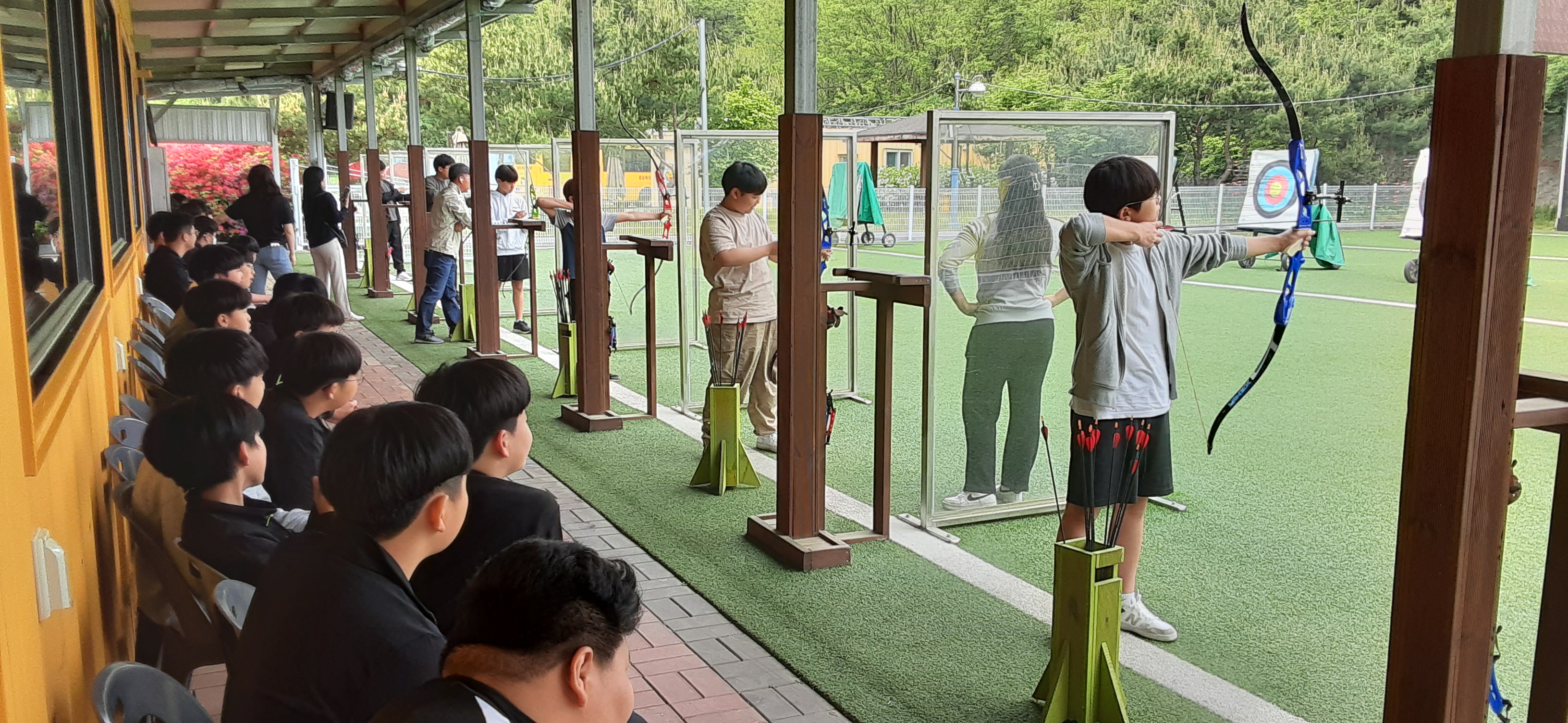 둘째 날은 약간 더운 날씨에 궁도의 고장 예천 진호국제양궁장에서 활체험이 있었다. 시청각 및 안전교육을 받은 후 양궁 리커브 활쏘기, 호버볼, 흡착활쏘기에 이어 서바이벌 게임까지 신나게 활동하고 나니 벌써 돌아갈 시간이 되어 많은 아쉬움을 남겼다.
