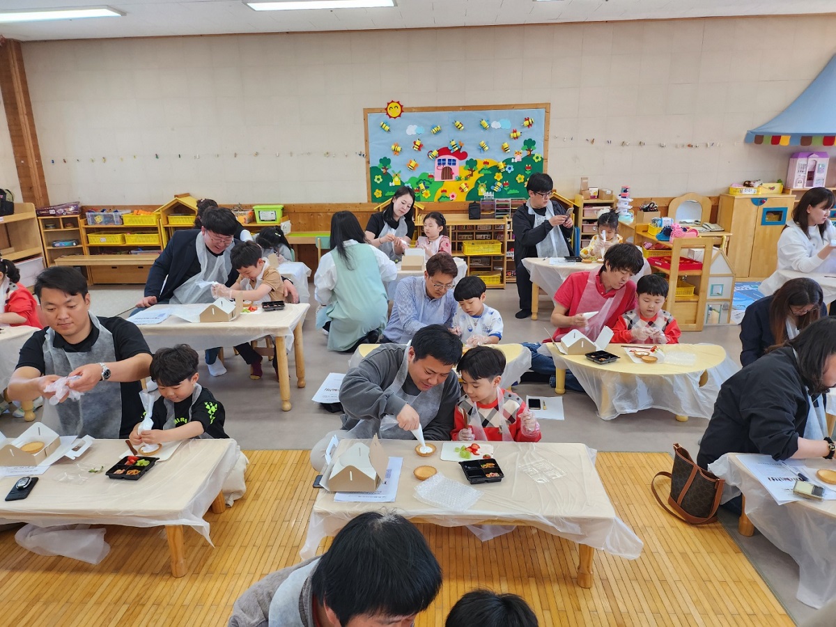 ◇ 보호자 참여수업은 <프랑스로 떠나요~ 과일 타르트!!>라는 놀이로 보호자와 유아들이 다양한 요리 재료를 이용해 과일 타르트를 만들어 보며 다른 나라의 문화에 대해 함께 체험해보는 시간을 가졌다.