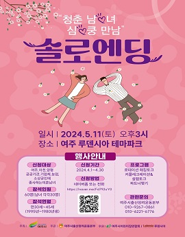 [금요저널] 여주시는 오는 11일 여주시 산북면 소재 ‘루덴시아 테마파크’에서 미혼남녀 만남 행사 ‘청춘남녀 심쿵만남 ‘솔로엔딩’’을 연다고 밝혔다.