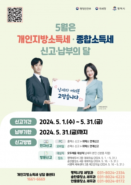 [금요저널] 평택시는 5월 종합소득세와 개인지방소득세 확정신고·납부의 달을 맞아 납세자 편의를 위해 종합소득세와 개인지방소득세를 동시에 신고할 수 있는 ‘합동도움창구’를 운영할 계획이라고 밝혔다.
