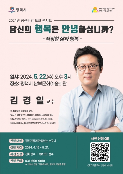 [금요저널] 평택시는 오는 22일 남부문화예술회관에서 ‘당신의 행복은 안녕하십니까?’라는 주제로 정신건강 토크콘서트를 개최한다고 밝혔다.