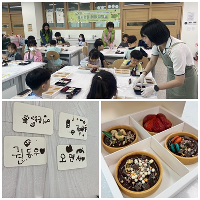 이번 교육은 ‘세상 하나뿐인 내 이름’을 주제로 ‘내 이름은 라울’이라는 동화책을 함께 읽고 초코펜으로 나의 이름과 감정을 표현해 보는 활동놀이와 딸기, 견과류 등 다양한 토핑 재료를 활용한 ‘초코타르트 만들기’ 푸드아트 활동으로 진행됐다.