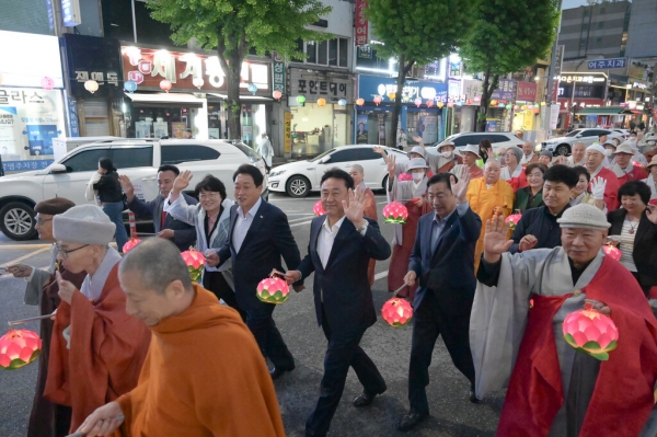 봉축 법요식이 끝난 후 진행된 제등행렬에는 7군단 군악대를 선두로 불교계 인사와 불자, 시장 및 국회의원 당선자 등과 함께 많은 시민이 행렬에 참여했다.