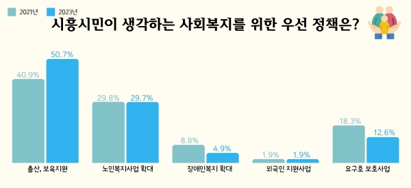 그럼 조사 결과 면면을 살펴보자.조사 결과에 따르면, ‘출산, 보육지원’이 50.7%로 가장 높게 나왔으며 다음으로 ‘노인복지사업 확대’가 29.7%, ‘요구호 보호사업’이12.6%, ‘장애인 복지 확대’ 4.9%, ‘외국인 지원사업’ 1.9% 순으로 나타났다.