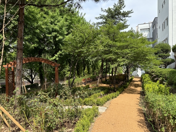 구는 사계장미 외 11종 2천87주와 수호초 외 4종 1천200본을 식재했으며 기존 교내 산책로 동선과 연계해 자연석판석과 보행매트로 산책로를 추가 조성했다.