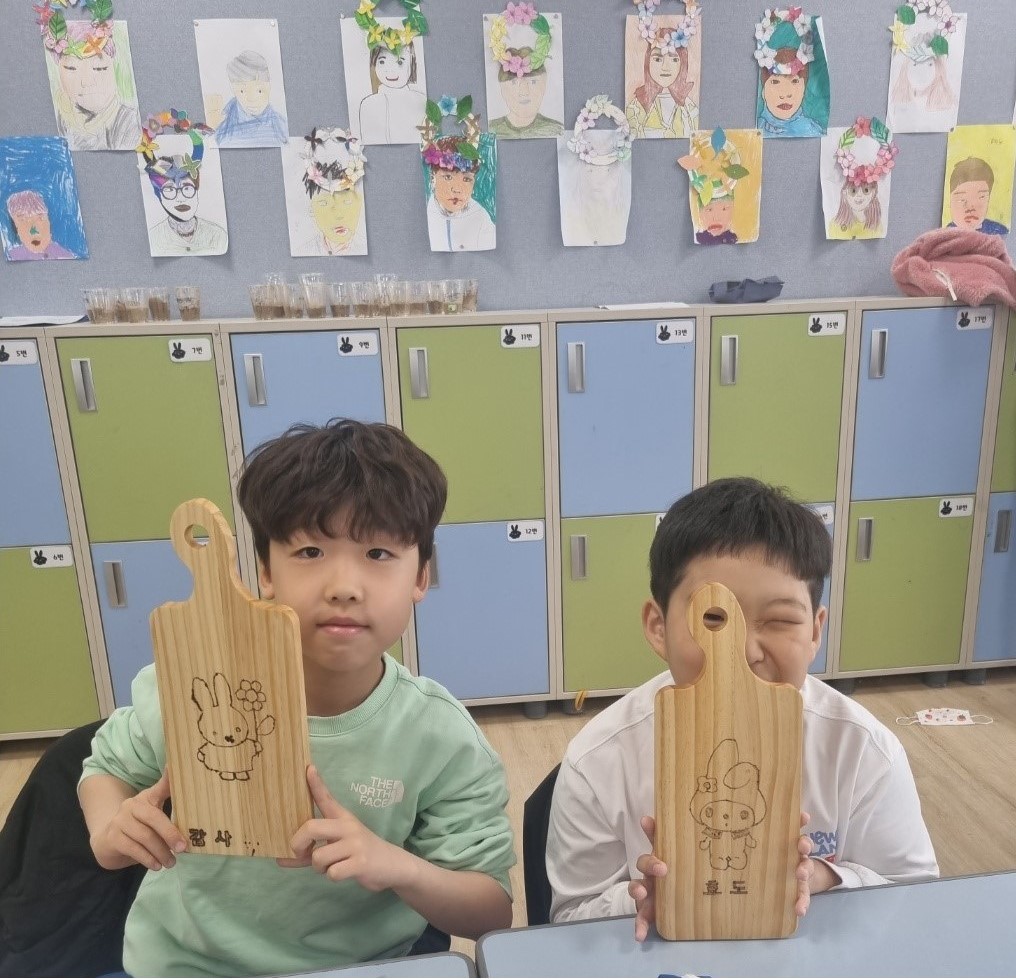 ▷ 이번 공예 체험교육은 전문 전기인두로 나무를 태워서 그림을 그리는 활동을 했으며, 나무가 타면서 나타나는 무늬와 풍기는 향기를 학생들이 오감으로 느끼는 특별한 시간이었다. 학생들은 ‘효’, ‘정직’, ‘책임’, ‘정직’, ‘소통’ 등의 인성 핵심 가치·덕목을 삼나무 플레이팅 도마에 그리며 일상생활에서 실천할 수 있는 인성 덕목을 내면화할 수 있었다.