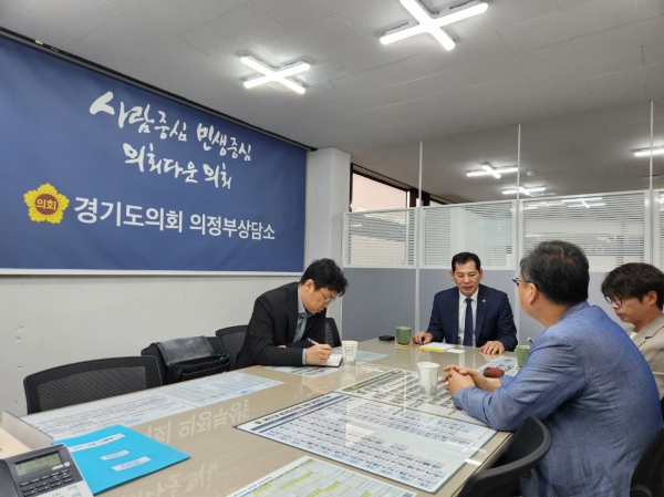 [금요저널] 경기도의회 문화체육관광위원회 이영봉 위원장은 지난 7일 도의회 의정부상담소에서 경기민예총 김태현 이사장, 김성수 사무총장, 한국민족예술단체총연합 강욱천 사무총장 등을 만나 ‘2024년 세계예술인한반도평화대회’ 예산 확충 요청 건의안 등 현안에 대해 논의하는 시간을 가졌다.