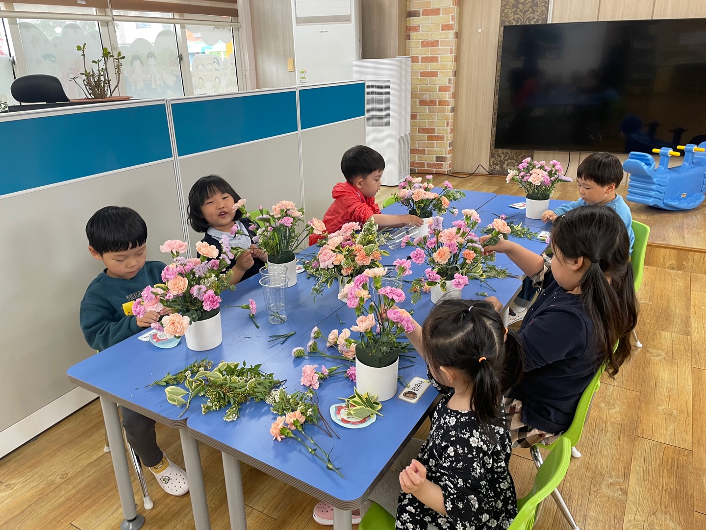 활동이 끝나자 유아들은 “빨리 엄마 아빠한테 꽃 드리고 싶어요. 엄마가 엄청 좋아하실 것 같아요.”라며 뿌듯한 모습을 보였다. 마지막에는 친구들과 서로의 작품을 소개하고 감상하는 시간을 통해 상대방을 존중하는 태도도 배울 수 있었다.