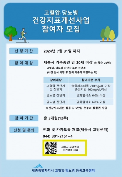 [금요저널] 세종시 고혈압·당뇨병 등록교육센터가 잘못된 생활 습관을 개선하고 자가건강관리 능력을 높이기 위한 ‘고혈압·당뇨병 건강지표개선 프로그램’ 참여자를 모집한다.