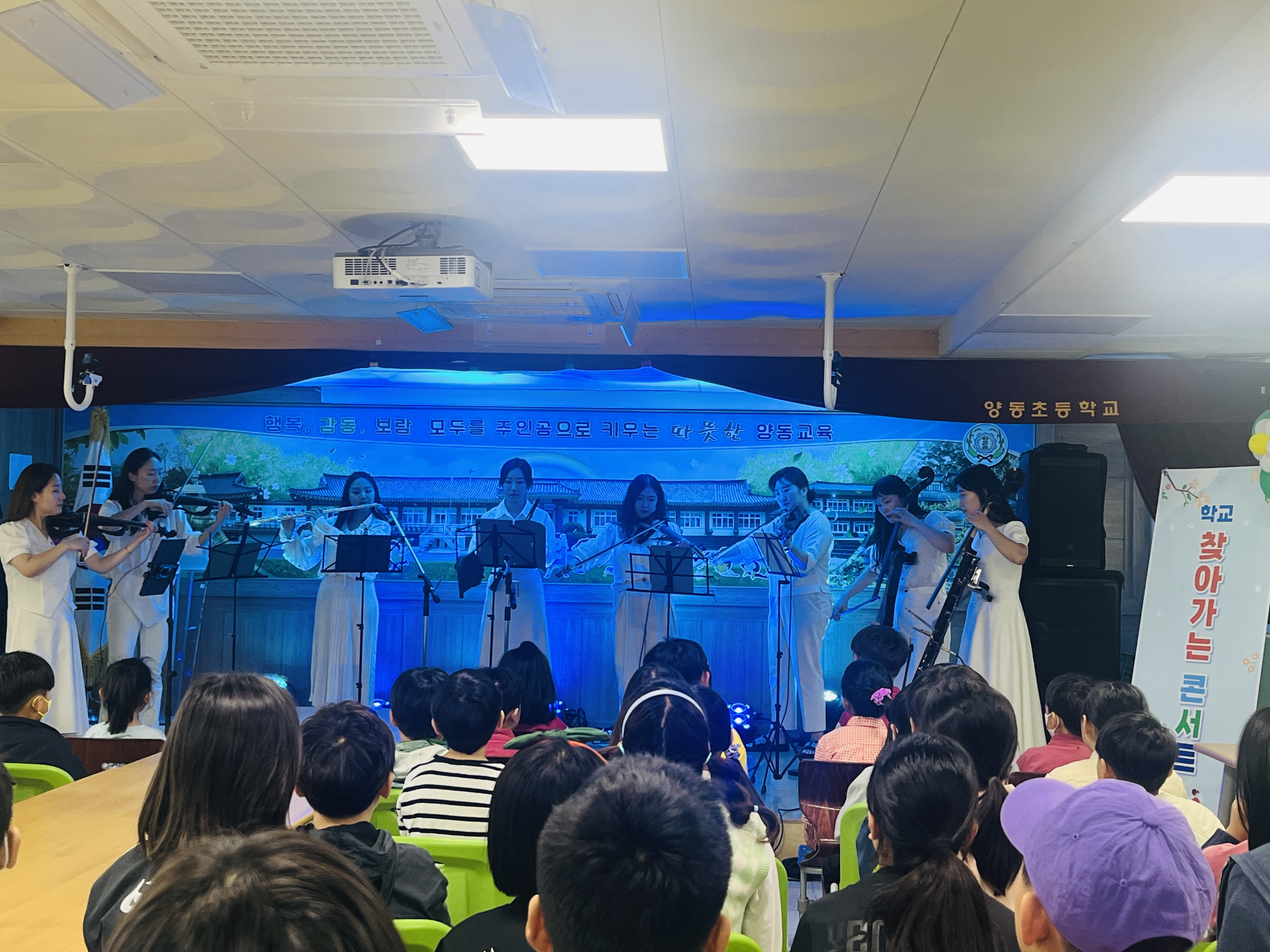 오케스트라 앙상블과 바이올린 및 플롯 독주, 성악으로 이루어졌던 이번 공연은 전교생들을 대상으로 정통 클래식 음악부터 귀에 익숙한 K-pop 연주까지 다양한 장르의 음악이 담긴 공연이었다. 테너와 소프라노의 깊은 음색으로 감상한‘꿈꾸지 않으면’과 ‘넬슨도르마’는 양동초 학생들에게 깊은 울림을 남겼다. 6학년 강○○ 학생은 “음악시간에 오케스트라에 대해 배우고 여러 악기를 본 적이 있는데, 바로 눈 앞에서 악기를 연주하는 모습을 직접 관람하니 생생함이 오래도록 남을 것 같다.”는 소감을 전했다.