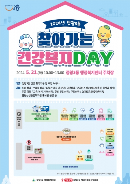[금요저널] 시흥시 정왕3동 지역사회보장협의체가 ‘2024년 상반기 찾아가는 건강 복지 데이’를 오는 21일 정왕3동 행정복지센터 주차장에서 오전 10시부터 오후 1시까지 진행한다고 밝혔다.