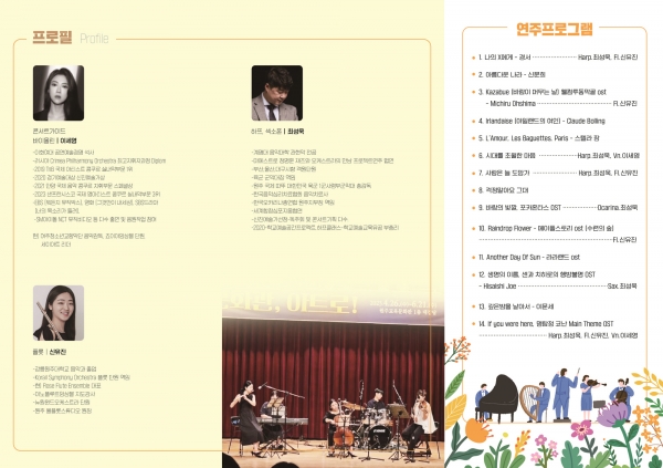5월 ‘아트&뮤직 려’ 프로그램은 가족을 대상으로 ‘하프와 함께 하는 아는 노래 이야기’ 라는 주제로 프로그램을 구성했으며 바이올린 및 콘서트가이드 이세영 / 플루트 신유진 / 하프 및 색소폰 최성욱이 참여한다.